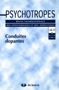 Conduites dopantes Vol. 8, 2002/3 - pagesPages 5 à 7Conduites dopantesPar Jean-Yves TréposPages 9 à 22Du dopage en particulier auxconduitesdopantes en général : le point sur les connaissancesPar Caroline Binsinger, Audrey FriserPages 23 à 29Conduites dopantes : à quoi s'engage-t-on ?Par Armelle Favre, Patrick LaurePages 31 à 38Les conduites dopantes : une prévention de l'échec ?Par Patrick LaurePages 39 à 46L'addiction à l'exercice physiquePar Dan VéléaPages 47 à 58Usages politiques du dopage sportif : de l'entreprise morale aux questions de santé publique ?Par Jean-Pierre EscrivaPages 59 à 68Pratiques sportives et prévention desconduites à risquePar Olivier MiddletonPages 69 à 87Les médecins du sport face au dopage (Note de recherche)Par Jean-Yves Trépos, Gisèle TréposPages 89 à 99La perception du dopage : une approche pragmatiquePar Patrick TrabalPages 101 à 120Course sur route amateur dans le département du NordPar Nadia Panunzi-Roger, Marielle Rengot, Madiou SampiPages 121a à 136aActes du colloque organisé par le Collège international de l’adolescence (CILA), Psychopathologie de l’adolescent et usage de cannabis, Ministère de l’Emploi et de la Solidarité, 17 novembre 2000.Par Irène CodinaPages 121b à 136bJEAMMET P., CORCOS M., Évolution des problématiques à l’adolescence : l’émergence de la dépendance et ses aménagements, Reuil-Mal-maison, Doin, 2001,94 p.Par Irène CodinaPages 121c à 136cPANUNZI-ROGER N., Le toxicomane et sa tribu, Paris, Les Éditions Desclée de Brouwer, 2000,192 p.Par Xavier-G. Le Gall