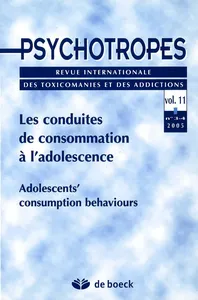 Les conduites de consommation à l’adolescence vol. 11, 2005/3 - pagesPages 5 à 8Les conduites de consommation à l'adolescencePar Michel HautefeuillePages 9 à 30Adolescence et dépendancePar Philippe JeammetPages 31 à 51Les usages de produits psychoactifs des étudiantsPar François Beck, Stéphane Legleye, Philippe Guilbert, Patrick Peretti-WatelPages 53 à 63La prise en charge des consommations de cannabis à l'adolescencePar Olivier PhanPages 65 à 84Nouvelles consultations de Marmottan : apports théoriques, expériences cliniquesPar Dan VéléaPages 85 à 96Le rôle de la recherche en sciences sociales dans les politiques de préventionPar Michel JoubertPages 97 à 111Danser avec les drogues : pop-musique, drogues et jeunesse britanniquePar Harry Shapiro, Anne SingerPages 113 à 120Bibliographie thématique sur le cannabisPar Clotilde CarrandiéPages 121 à 144La recherche de sensations : quel traitement de l'émotion ?Par Solange CartonPages 145 à 157La mesure Min Risk Addictions : intérêts et limitesPar Éric ChagnardPages 159 à 178Relation thérapeutique et « soins obligés » en toxicomaniePar Anne Biadi-ImhofPages 179 à 207Pratiques médicales et usages de drogues : linéaments de la construction d'un champPar Jean-Bernard WojciechowskiPages 227 à 256Le tour du monde en 500 sites de préventionPar Anne SingerPages 257 à 260Note de lecturePar Pascal HachetPages 209 à 225Les effets de la « question miracle » dans les textes de patients alcoolodépendantsPar Sylvie Petit