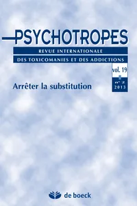 Arrêter la substitution Vol. 19, 2013/2 - pagesPages 5 à 8Arrêter la substitutionPar Michel HautefeuillePages 9 à 22Arrêter la méthadone, pour quoi faire ?Par Jean Dugarin, Gaël Dupuy, Patrice NominéPages 23 à 44Représentation des traitements de substitution aux opiacés et de leur arrêt. Regards croisés patients/médecinsPar Morgane Guillou Landreat, Charles Rozaire, Caroline Vigneau Victorri, Marie Grall-BronnecPages 45 à 66Recours aux traitements de substitution dans les sorties des addictionsPar Laurence Simmat-Durand, Maëlle Planche, Marie Jauffret-Roustide, Claude Lejeune, Laurent Michel, Sarra Mougel, Natacha VellutPages 67 à 81Arrêt des traitements de substitution : point de vue cliniquePar Muriel GrégoirePages 83 à 96Étude rétrospective à deux ans des hospitalisations pour arrêt de la méthadone au Centre Médical MarmottanPar Héloïse Pham-OrsettiPages 97 à 105Le temps des vacances : un temps impossible pour les toxicomanes ?Par Mario Blaise, Emmanuelle Picot