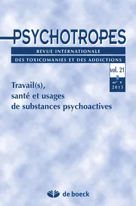 Travail(s), santé et usages de substances psychoactives Vol. 21, 2015/1 - pagesPages 5 à 9Travail(s), santé et usages de substances psychoactivesPar Renaud Crespin, Gladys Lutz Nale, Michel HautefeuillePages 13 à 34Pratiques addictives en milieu de travail : impasses du concept et nouvelles perspectivesPar Gladys Lutz NalePages 35 à 54Le sens des mesures. Usages et circulation des chiffres dans la définition du problème public des drogues au travailPar Renaud CrespinPages 55 à 76L’appropriation du paradigme addictologique à la SNCF : entre réceptions négociées et usages détournésPar Félix LemaîtrePages 77 à 95Les formes différenciées d’usages de produits psychoactifs au travail : les cas des bars-restaurants et des chantiers du bâtimentPar Marie Rosaire Ngo NguenePages 97 à 111Les usages de drogues dans les marges du travail : le cas de sans-abri lilloisPar Vianney SchlegelPages 115 à 115PrésentationPar Michel HautefeuillePages 116 à 125Du vin et du haschischPar Charles Baudelaire