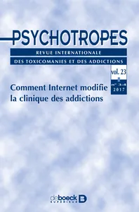 Comment Internet modifie la clinique des addictions Vol. 23, 2017/3 - pagesPages 5 à 8Comment Internet modifie la clinique des addictionsPar Michel HautefeuillePages 9 à 20L’ère numérique, une époque de mutations pour la médecine des addictionsPar Sophia Achab, Daniele ZullinoPages 21 à 40Revue systématique de la littérature évaluant l’efficacité des outils de jeu responsable existants pour les jeux de hasard et d’argent en ligne : mise au point et perspectivesPar Julie Caillon, Marie Grall-Bronnec, Gaëlle Challet-Bouju, Lucia RomoPages 41 à 55Usages problématiques de jeux vidéo : l’âme et le corps substituésPar Elizabeth RosséPages 57 à 74Quand la question de l’argent dans le jeu vidéo influence la pratique clinique en addictologiePar Pierre Taquet, Lucia Romo, Olivier CottencinPages 75 à 80Identifier, comprendre et intervenir sur les espaces sociaux numériques liés aux droguesPar Vincent BensoPages 81 à 103Évolution comparée des politiques de régulation du tabac en Europe et aux États-UnisPar Ivana Obradovic, Anne-France TaicletPages 105 à 123Les médicaments détournés de leur usage médical par les jeunes : une revue de la littératurePar Maitena MilhetPages 125 à 163État des lieux de la recherche sur les capacités thérapeutiques des « substances hallucinogènes » au 21e sièclePar Christian SueurPages 165 à 182Les hospitalisations interrompues de manière prématurée – Étude réalisée au sein d’une unité de sevrage physiquePar Anne Bouchez, Ronald Clavie, Bénédicte de Villers